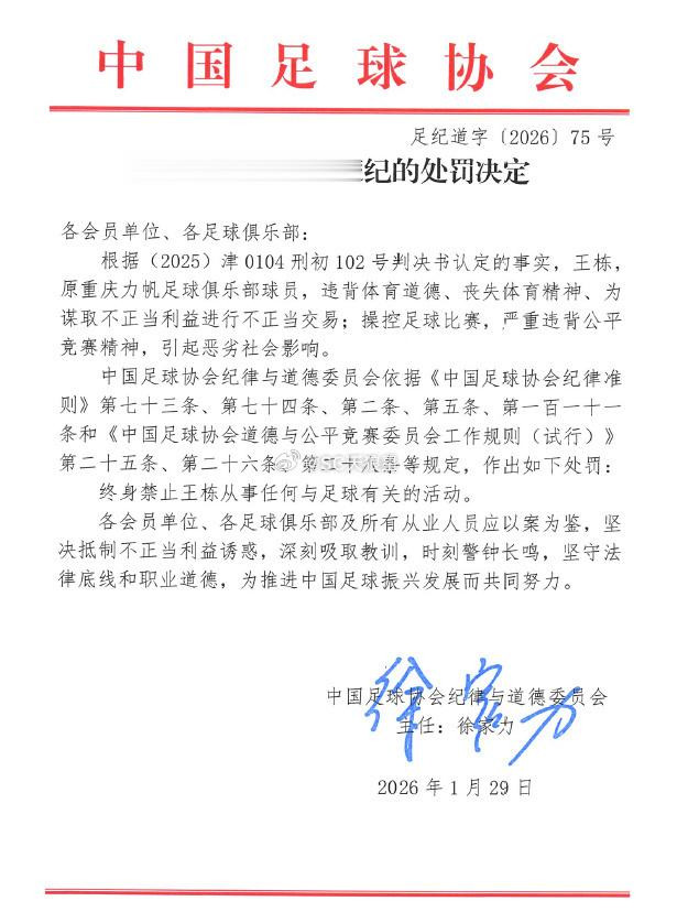 周四,中国足协正式公布受处罚俱乐部名单。天津津门虎被罚10分,王栋、邓小飞则遭到终身禁足。
